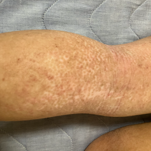 アトピー肌が改善する経過には写真の様にマダラ模様の肌になる事が多々あります。肌の新陳代謝が活発となる事で起きる現象であると考えますが