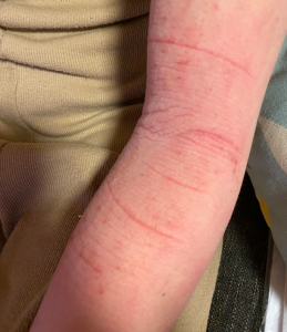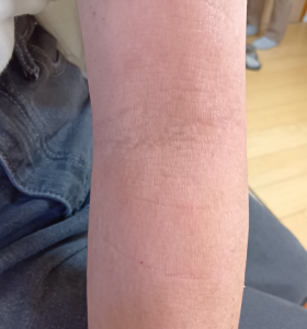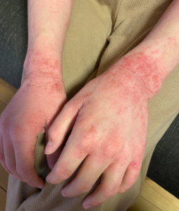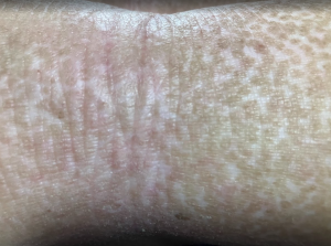 アトピー肌が改善する経過には写真の様にマダラ模様の肌になる事が多々あります。肌の新陳代謝が活発となる事で起きる現象であると考えますが