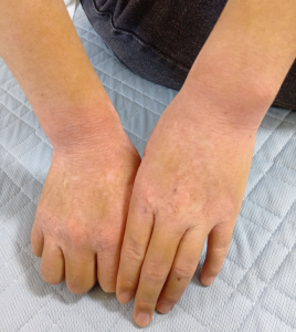動画で説明していますが、肌のゴワゴワ感が最初の頃と比べ軽減しています。ステロイド療法を長期間にわたり続ける事で肌が硬く像の様な肌になる事が多いようです。